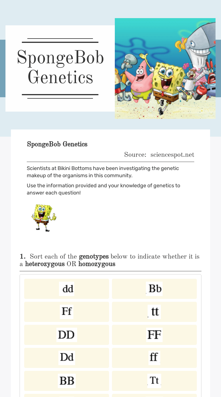 Spongebob Genetics Worksheet - Spongebob Genetics Teaching Resources :. Spongebob is heterozygous for his square shape, but spongesusie is round. Use the information for spongebob's traits to write the phenotype (physical appearance) for each . Spongebob is heterozygous for his square shape, but spongesusie is round. Use your knowledge of genetics to complete this worksheet. Spongebob squarepants recently met spongesusie roundpants at a dance.