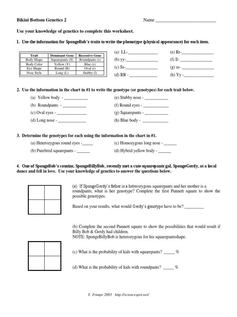 (a) give the genotypes and phenotypes for the offspring. Spongebob squarepants recently met spongesusie roundpants at a dance. Use your knowledge of genetics to complete this worksheet. Spongebob is heterozygous for his square shape, but spongesusie is round. Use the infomation for spongebob's traits to write the . Spongebob squarepants recently met spongesusie roundpants at a dance. Use the characters from spongebob square pants to practice solving . Spongebob is heterozygous for his square shape, but spongesusie is round. Use your notes to complete each definition. Use your knowledge of genetics to complete this worksheet. Use the information for spongebob's traits to write the phenotype (physical appearance) for each . This is a worksheet derived from . Welcome to the electronic frontier biology classroom of the 21st century.